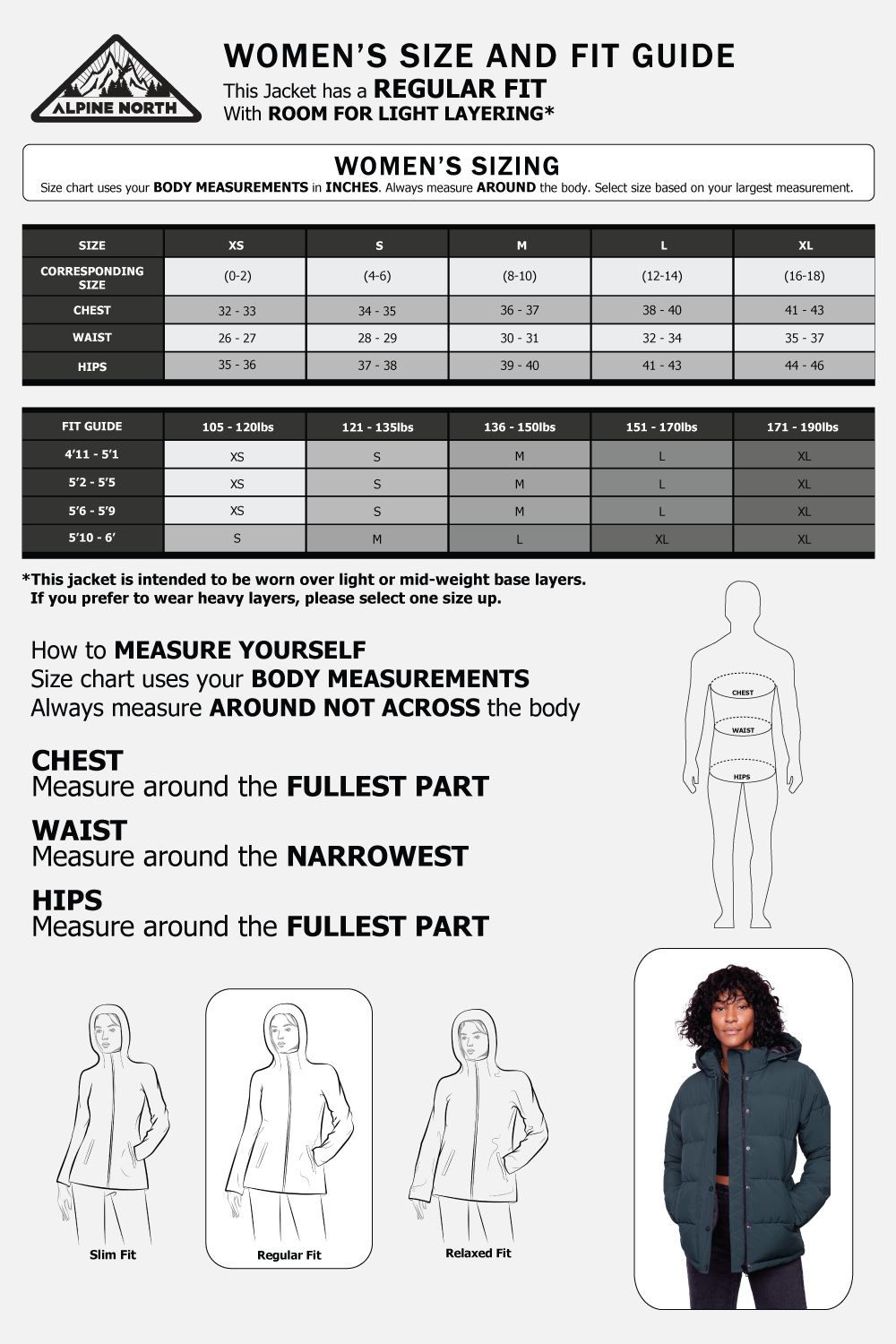 Our jackets are seriously warm, so we have designed them to be worn over light clothing or base layers. If you are someone who loves to layer up with heavier sweaters, we suggest ordering one size up from your normal size.