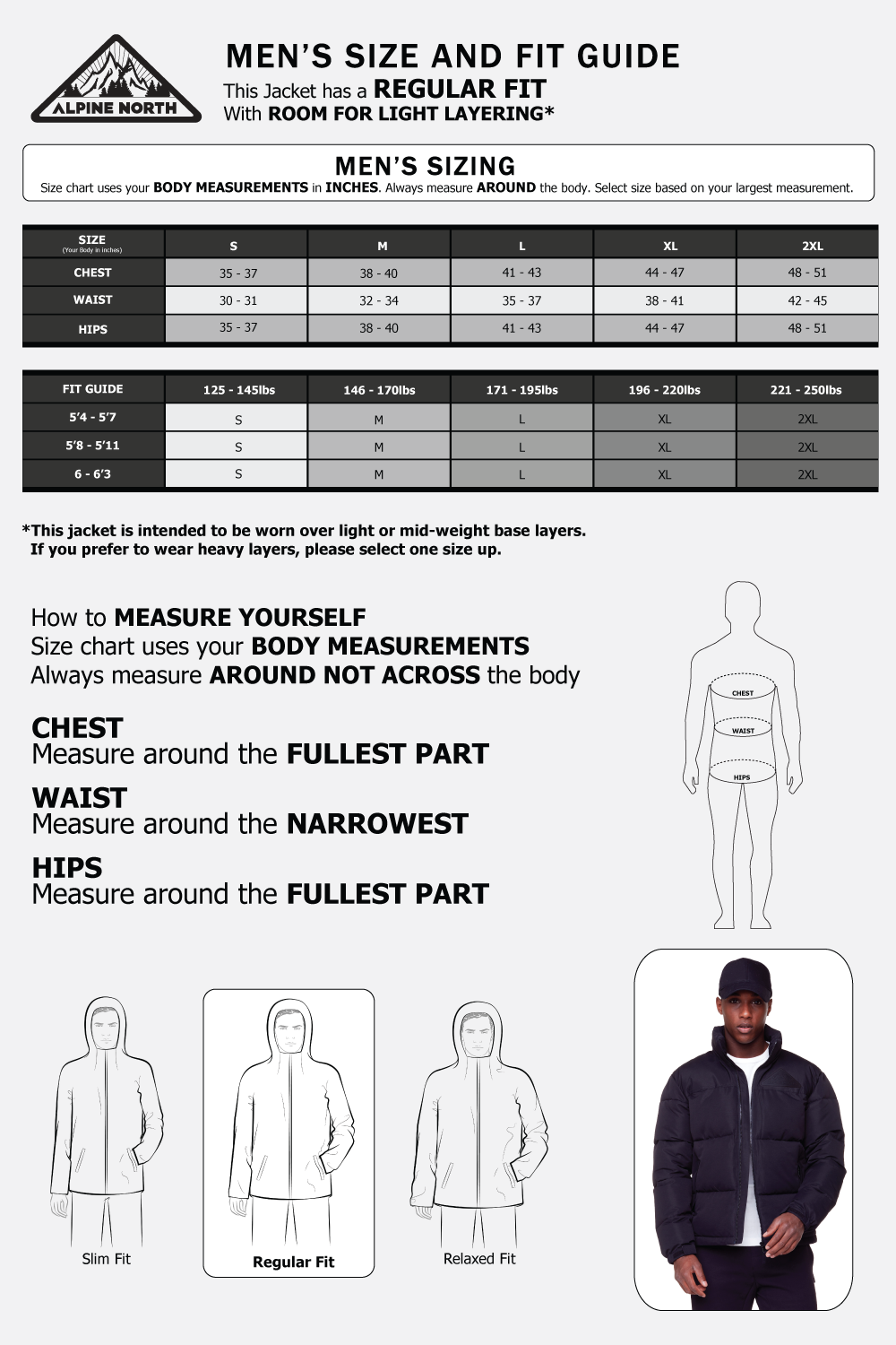 Our jackets are seriously warm, so we have designed them to be worn over light clothing or base layers. If you are someone who loves to layer up with heavier sweaters, we suggest ordering one size up from your normal size.